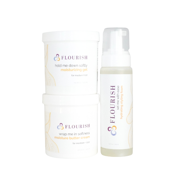 This bundle is the new Flourish styling bundle! This bundle has the Flourish Hydrating Styling Foam, the Wrap me in Softness Moisturizing Butter and the Flourish Hold me Down Softly Moisturizing Gel. This is great for anyone dealing with moisture issues. You can pair the foam with the butter and you can the foam with the gel.